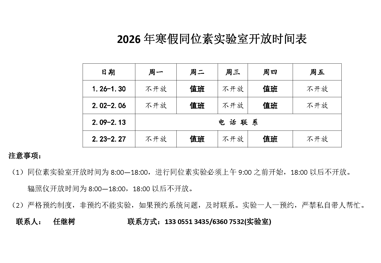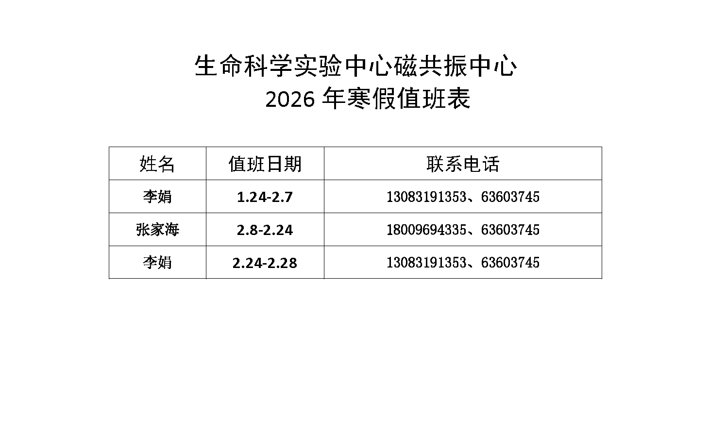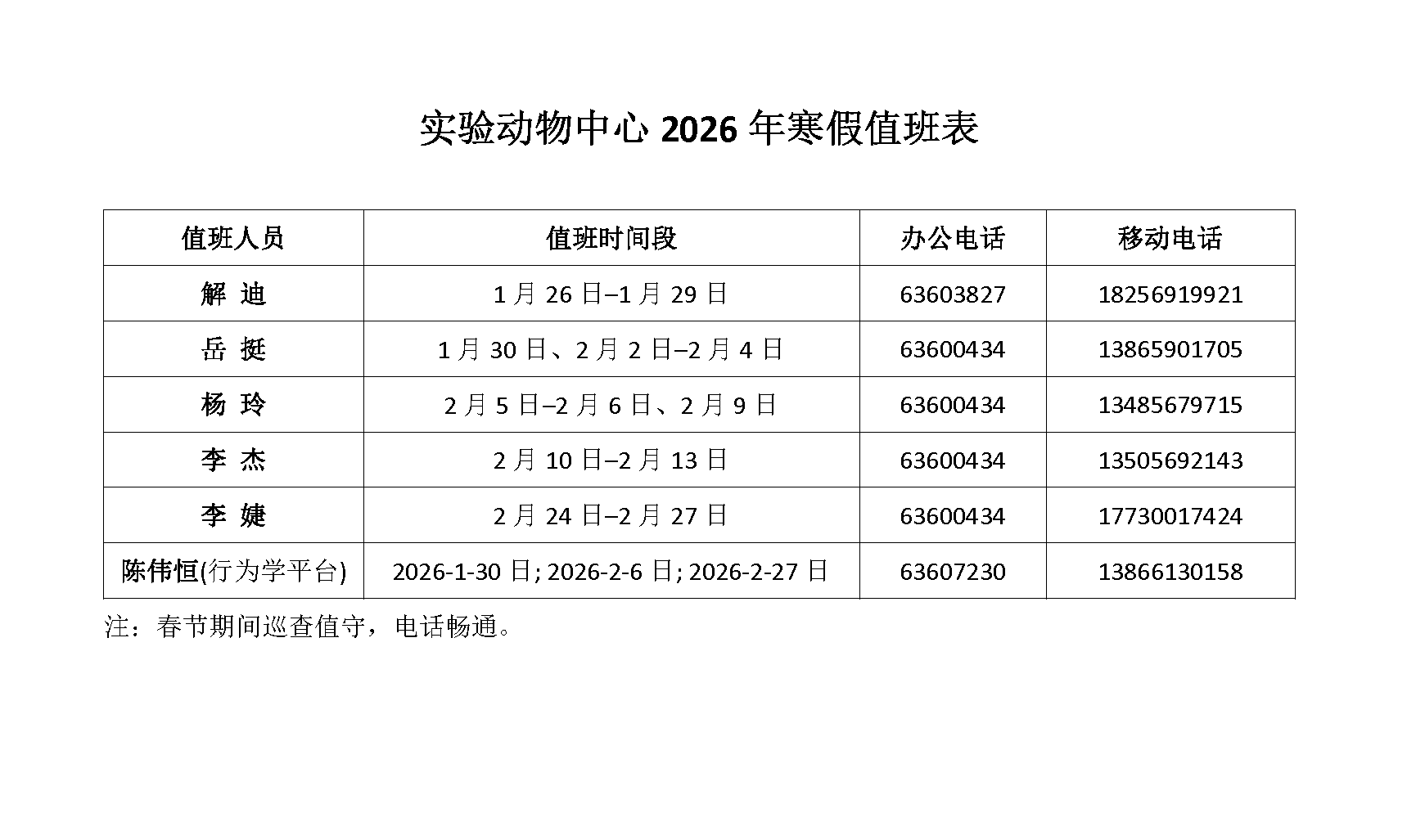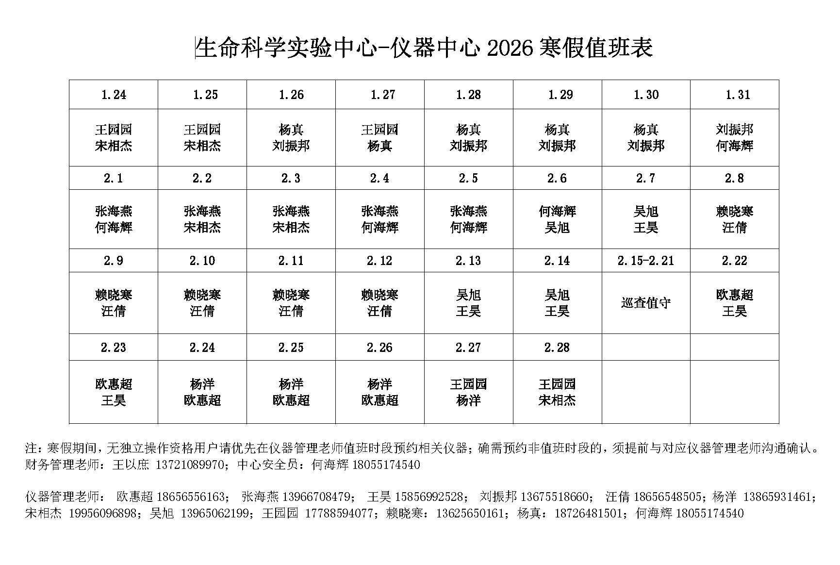 生命科学实验中心2026年寒假值班表